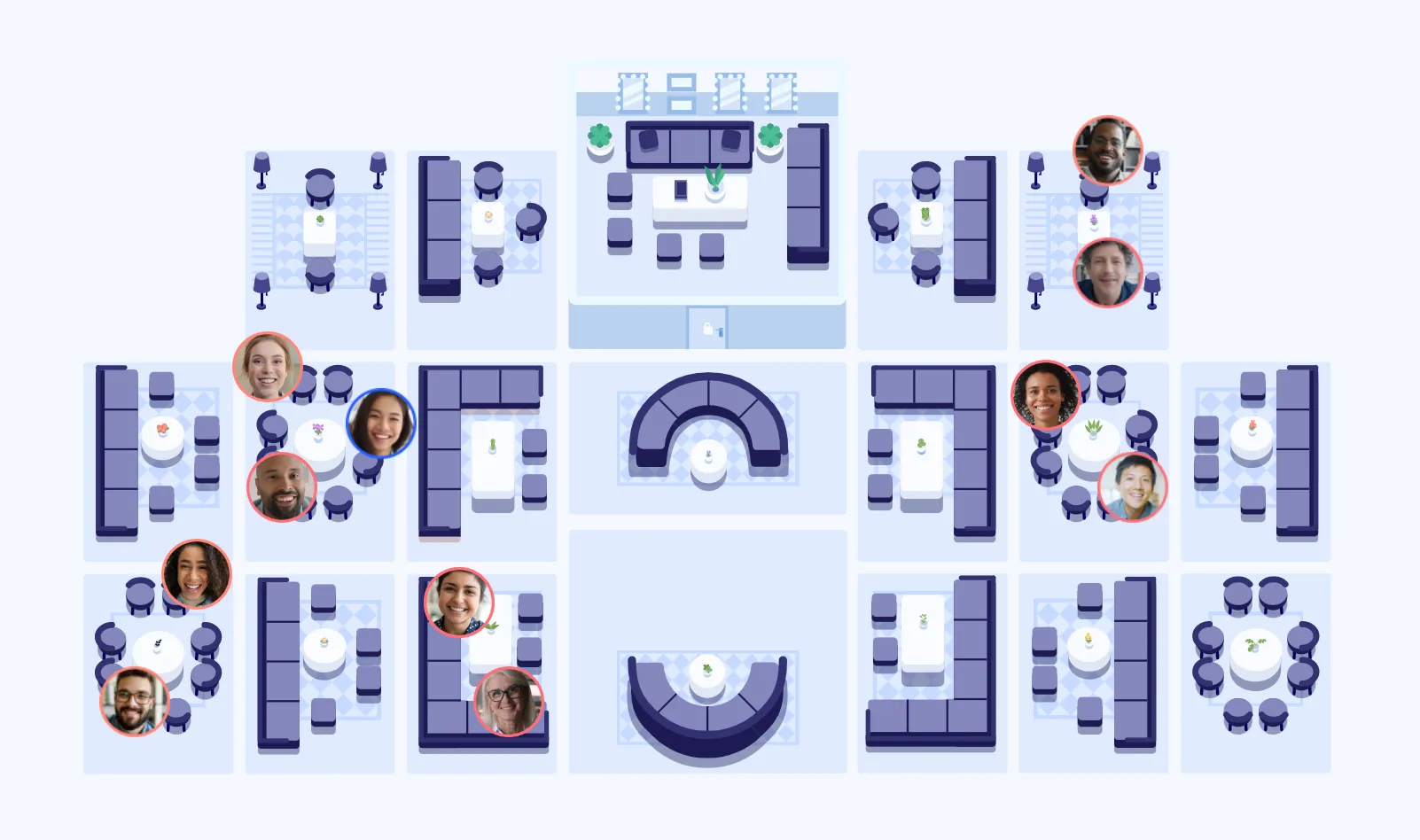 6つの椅子に囲まれたテーブルが多く配置されているバーチャルな部屋に入り,それぞれのテーブルで会話をしたり,主催者が全員に向けて話したりして会議を進めることができるオンラインコミュニケーションツールです.