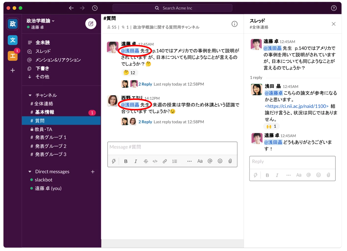 • 各質問に対し,「スレッド」で返信することで,質問と回答の階層構造を明確化し,多くの質問が来ても,各質問に対応する回答がどれか分かりやすくなる.