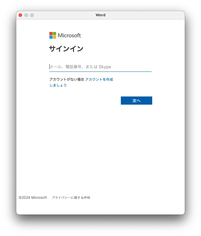 Mac環境のOfficeアプリでは,利用に際してライセンス認証のための操作は不要です.Officeアプリを起動後そのまま利用できます.