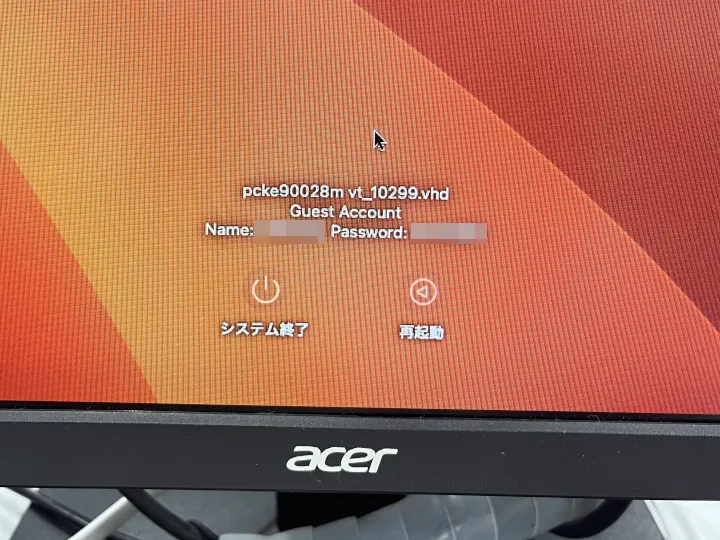 - Mac環境が起動するとログイン画面が表示されます.ログイン画面に記載されているゲストアカウントのユーザー名とパスワードを入力して,Mac環境にログインしてください.