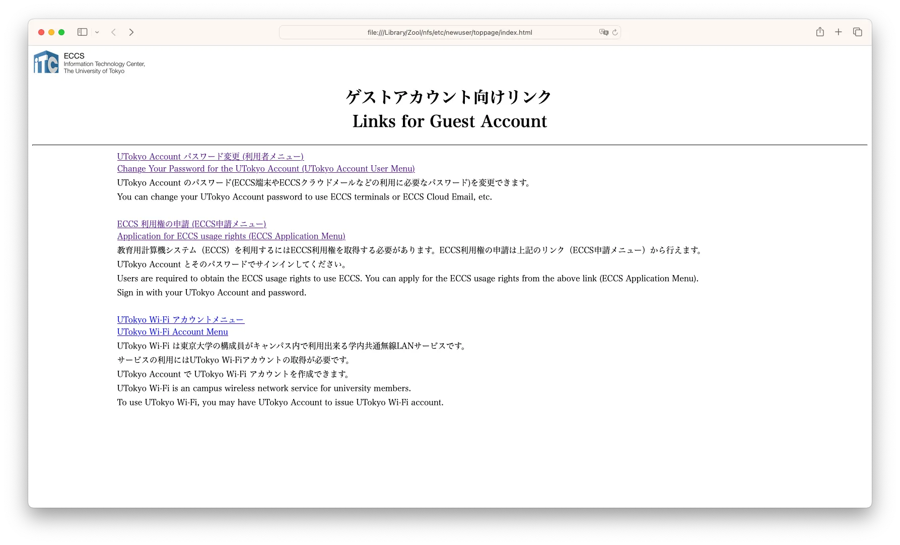 教育用計算機システム(ECCS)のウェブサイト(www.ecc.u-tokyo.ac.jp)は2024年6月をもって閉鎖されました.今後,ECCS端末に関する情報は,uteleconに掲載される予定です.旧ウェブサイトに掲載されていた情報のうち現在も有効なものは,順次uteleconに移行します.旧ウェブサイト閉鎖時点でのアーカイブサイト(www-old.ecc.u-tokyo.ac.jp)を設置していますので,併せて参照してください.