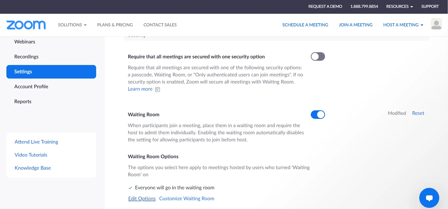 • (1) ”Waiting Room” & (2) ”Require authentication to join”: These fields can be found under the “Security” section in the “Schedule a Meeting” page. Please also refer to the “Scheduling a Zoom Meeting (Web Portal)” page for procedures to schedule a meeting.