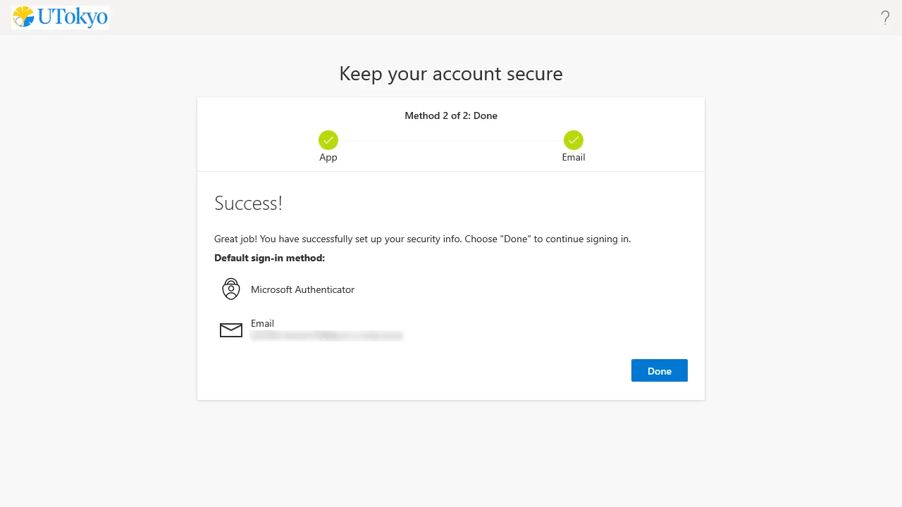 You have completed the initial setup procedures for UTokyo Account, but it will take about 30 minutes for the account settings to be reflected in the system after these procedures. If you want to use systems that do not allow you to sign in until the multi-factor authentication settings are completed, please be patient and wait for a while.