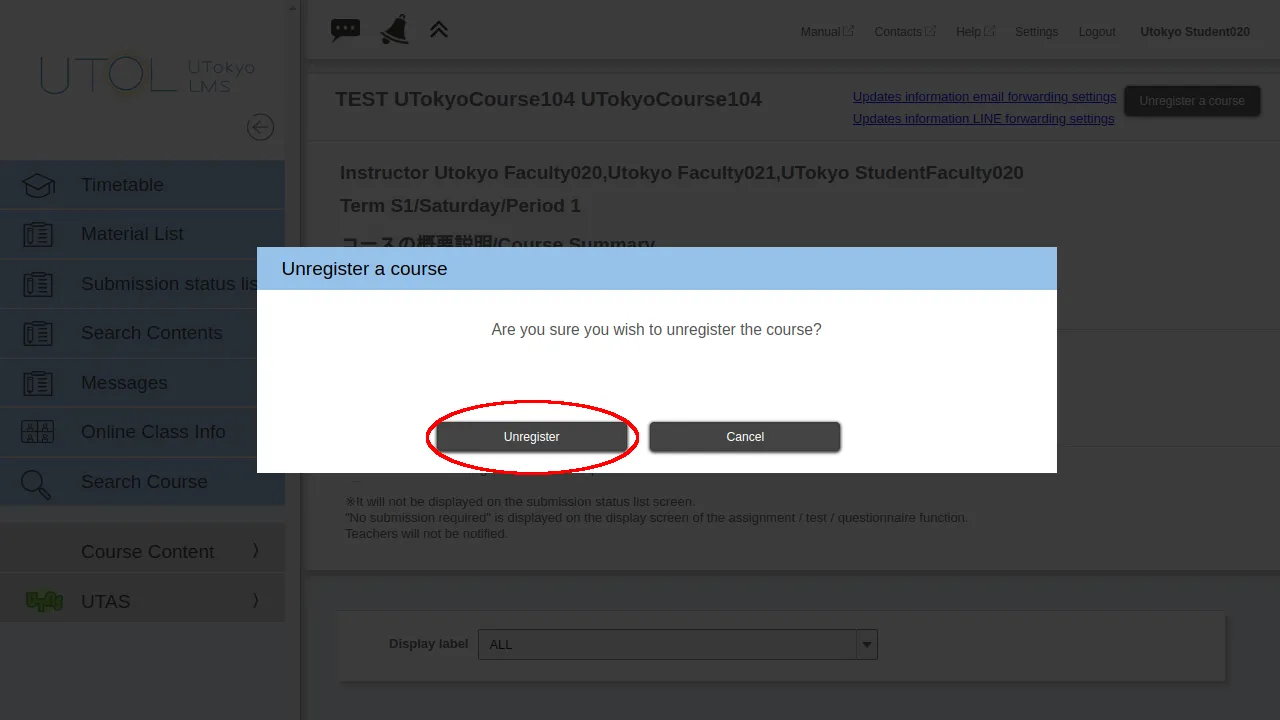 • “Enrolled registration”: If you cancel your registration on UTAS during the enrollment registration/modification period, your course registration will be canceled the following morning. At any other period, the course registrations cannot be canceled.