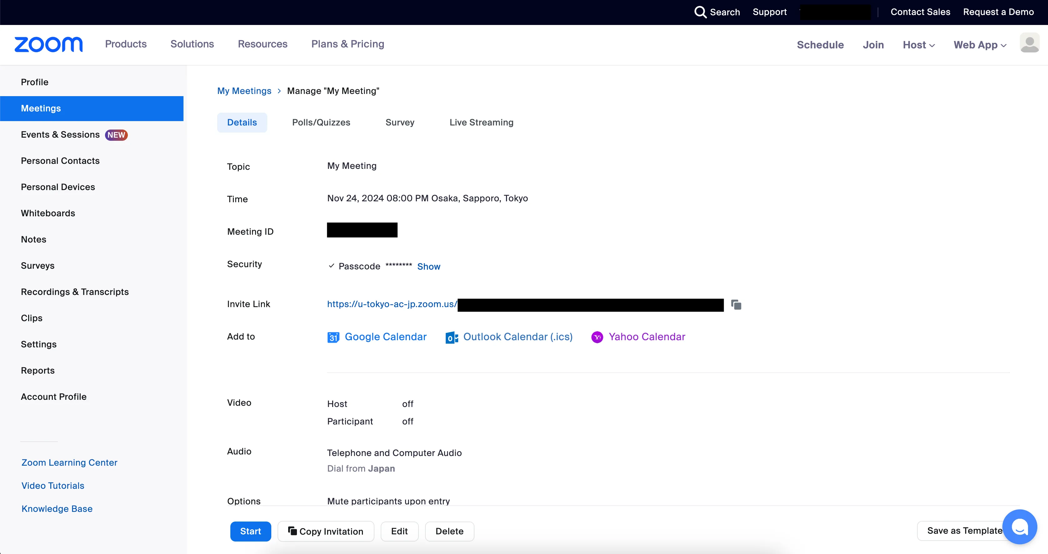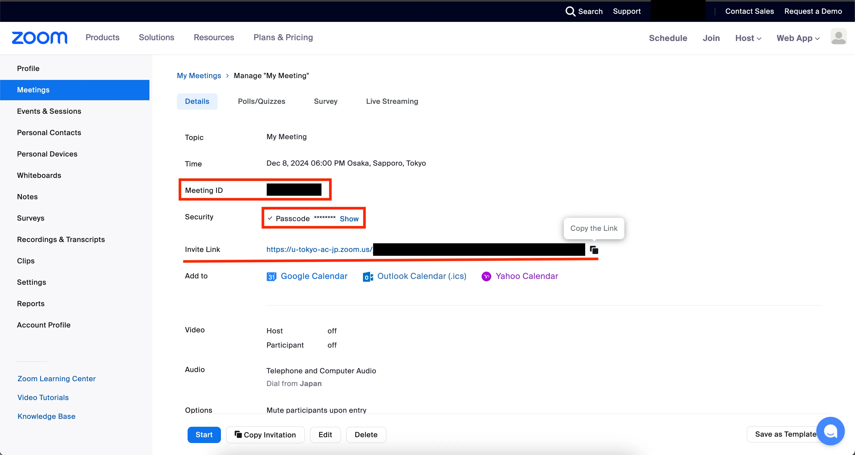 5. The details of the meeting created will be displayed. Verify that it has been set up according to the settings you configured earlier.