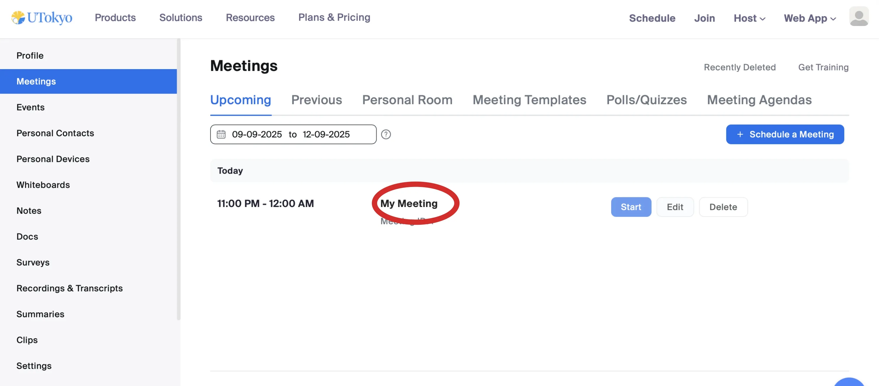 • Hover over the meeting you want to operate on, and click the Edit button that appears. This opens the Edit “My Meeting(This is where the name of the meeting you scheduled will be inserted)” screen.