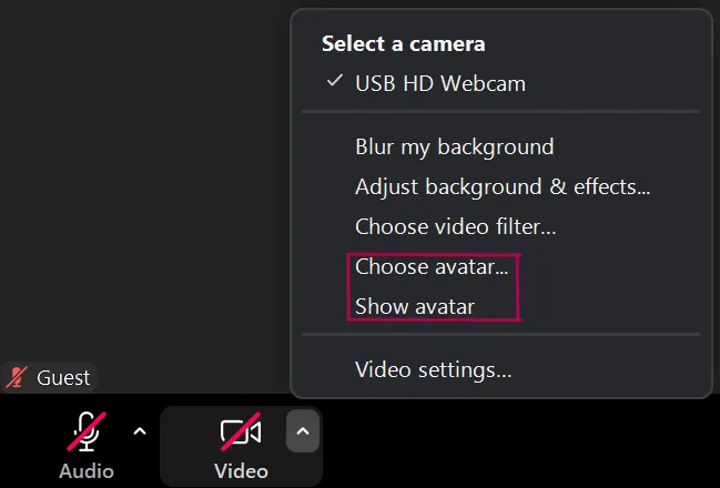 2. Select “Choose avatar” from the menu. (Select “Show avatar” to display the preconfigured avatar.)