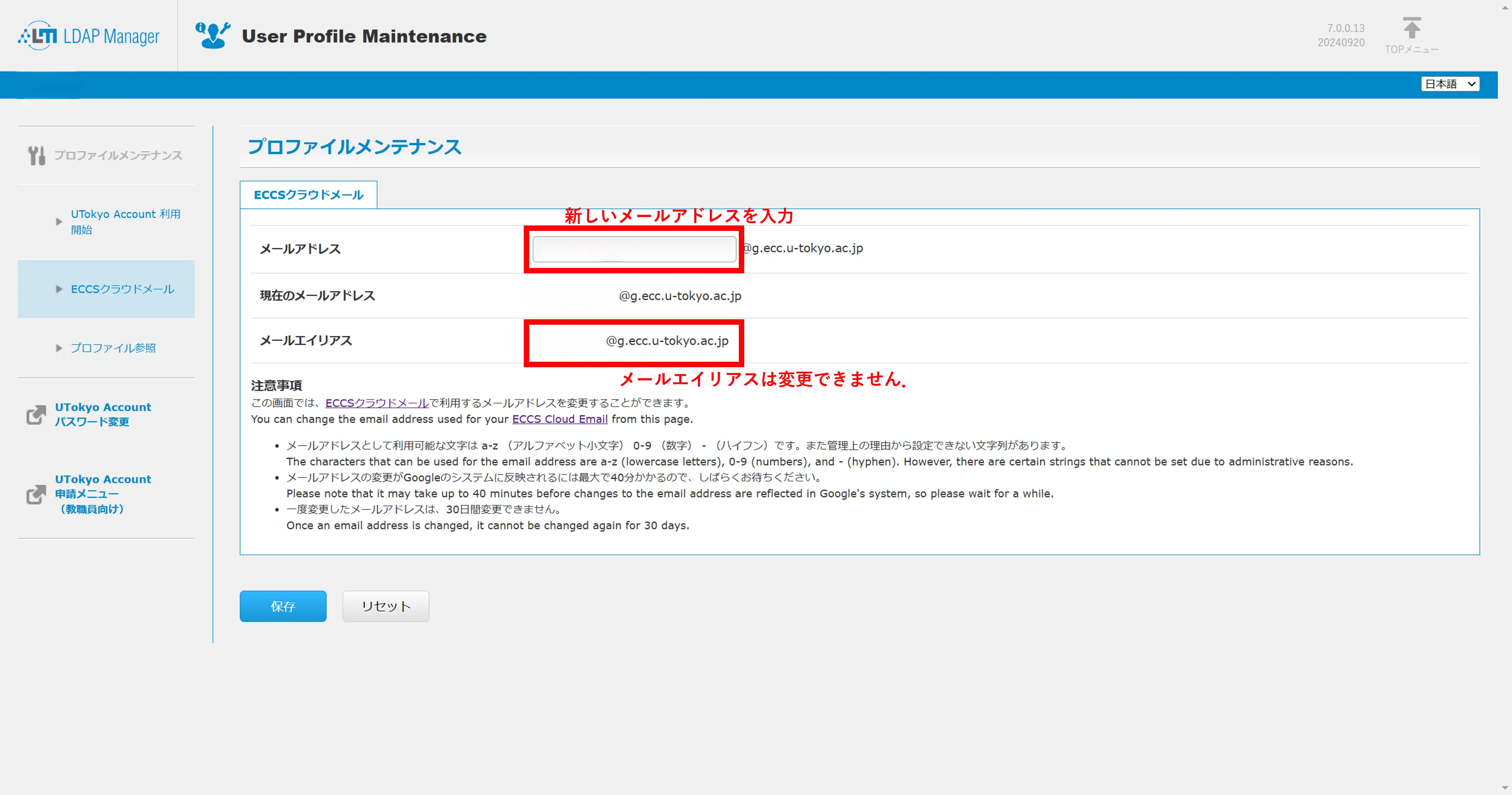 @utac.u-tokyo.ac.jp)とパスワードを入力してログインしてください. - 左のメニューにある「ECCSクラウドメール」を押すとメールアドレスの設定画面が表示されます.「メールアドレス」欄に好みのメールアドレスを入力して,「保存」ボタンを押してください.