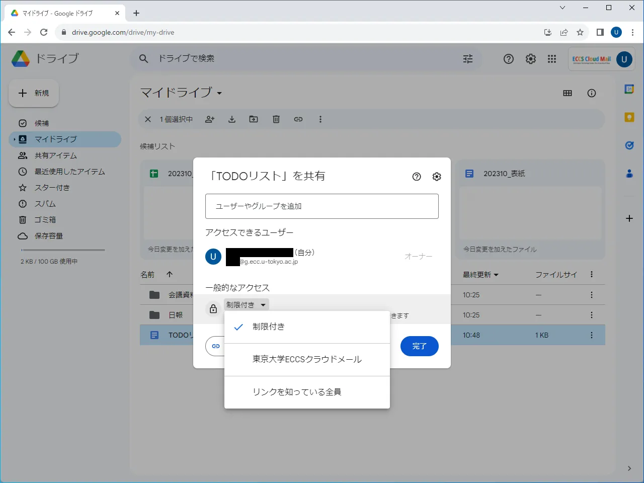 • 誰でもアクセスできるようにする設定と,東京大学のECCSクラウドメールのアカウントを持っている人に限り誰でもアクセスできるようにする(ECCSクラウドメールのアカウントを持っていない人を除外する)設定の,2つの設定が可能です.
