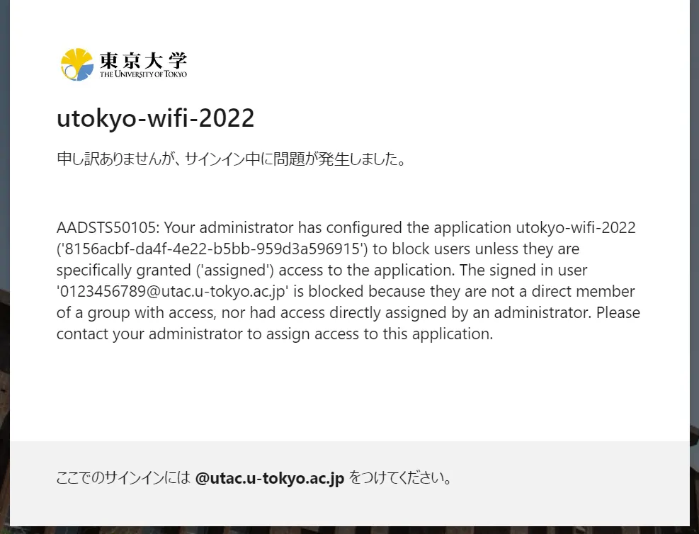 以下の画像のようなエラー(エラーコード:AADSTS50105)が表示されてしまい,UTokyo Wi-Fiアカウントメニューにサインインできない場合,UTokyo Wi-Fiの利用に必要な,情報セキュリティ教育の受講が完了していない可能性があります.情報セキュリティ教育のページを確認し,確認テストに合格してください.テストに合格するとその結果が即座にシステムに反映されます.