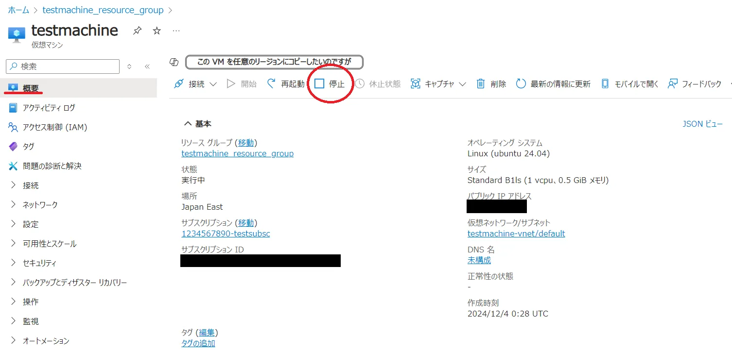 • 仮想マシンリソースの詳細で上部に、停止ボタンがあるのでクリックする.