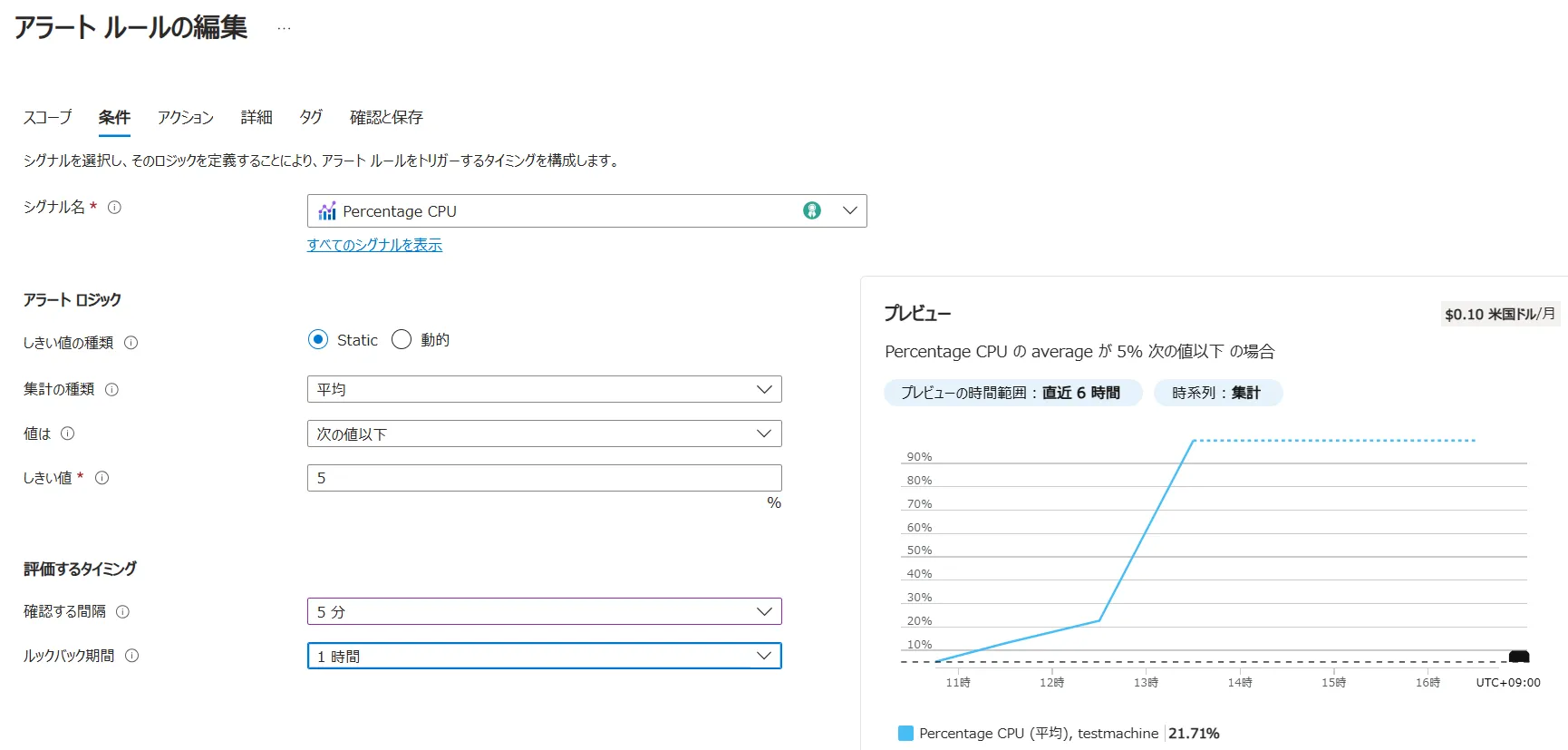 仮想マシンはバックグラウンドでも動作しているため,あまり低いCPU使用率を閾値として設定するといつまでも条件にヒットしません.かといって高すぎると常時ヒットしてしまい,コンソール作業中等でも問答無用でシャットダウンされるようになってしまいます.条件パート画面では,画面右側に過去6時間(初期設定)の監視結果のグラフが表示されます.また,AI等の計算を実行している時は常に100%に近いCPU使用率になります.それらを参考にしきい値を決めてください.