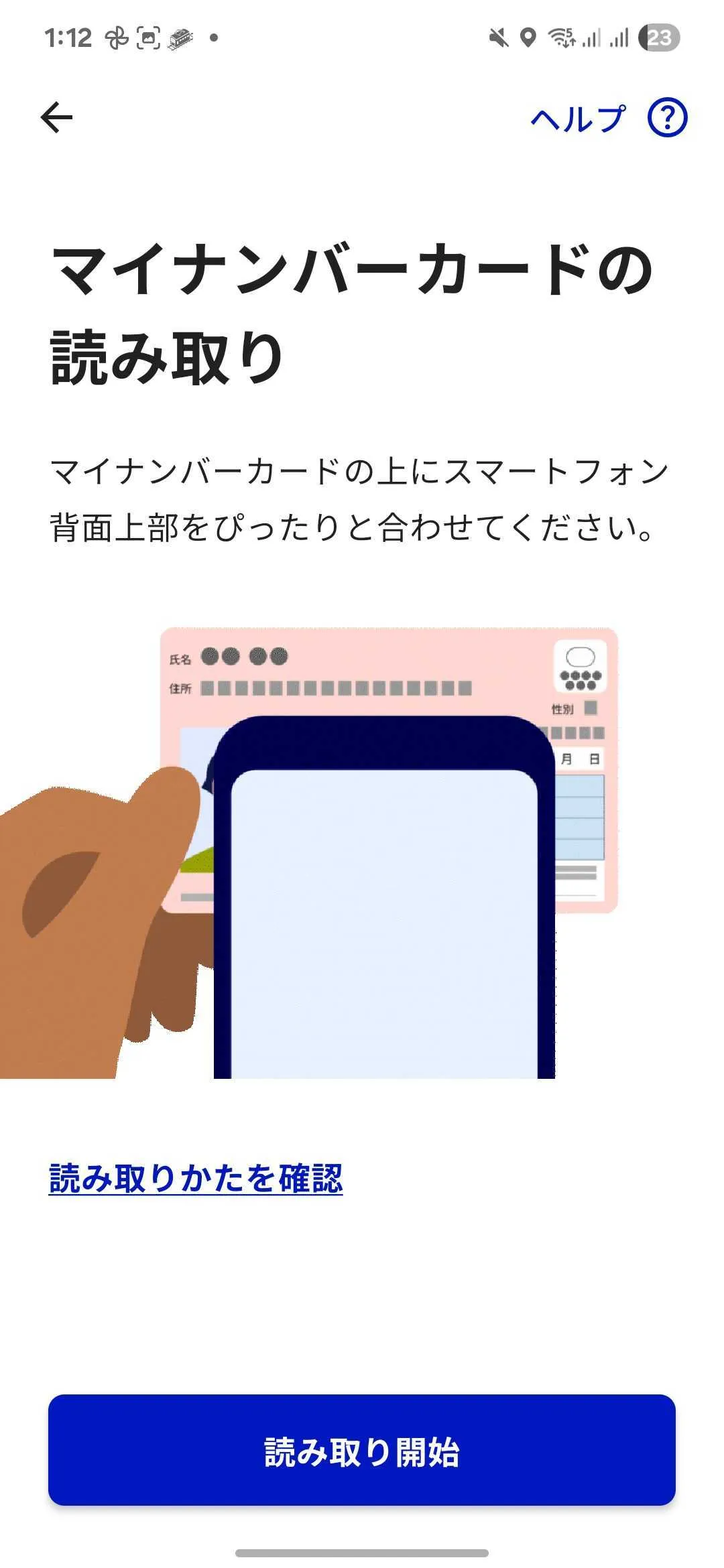 アプリの案内に従い,「読み取り開始」ボタンを押し,マイナンバーカードをスマートフォンで読み取ってください.