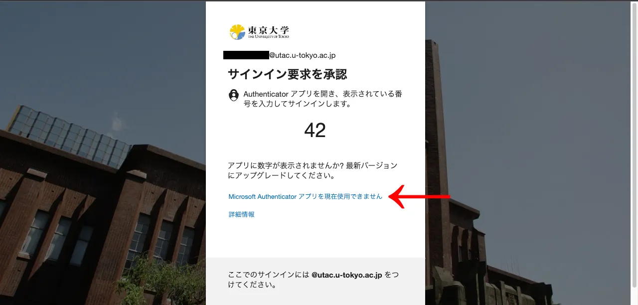 - UTokyo Accountでサインイン時(パスワード入力後)にデフォルトの本人確認方法で多要素認証の本人確認を行う画面が表示されますが,その画面で「問題がありますか? 別の方法でサインインする」あるいは「Microsoft Authenticator アプリを現在使用できません」というリンクを押してください.