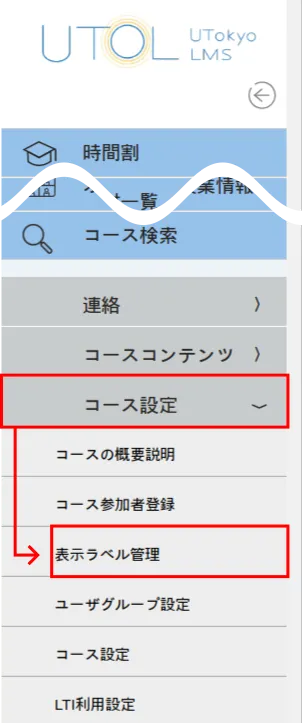 1. 「コース設定→表示ラベル管理」等の表記は,左メニュー(画面左上の三本線のボタンを押すと左側に表示されるメニュー)内の「コース設定」の中にある「表示ラベル管理」という意味です.