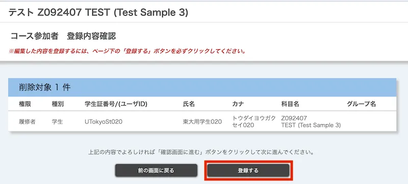 - 削除対象のユーザ(権限)が表示されるので,変更内容を確認の上,「登録する」を押してください.