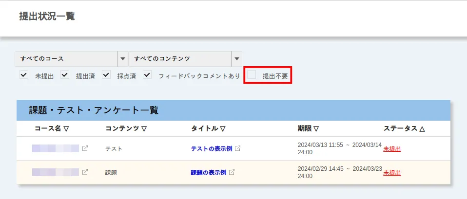 チェックを外すと再び提出状況一覧に表示されるようになりますが,個別に提出不要にしていた項目は引き続き表示されません.