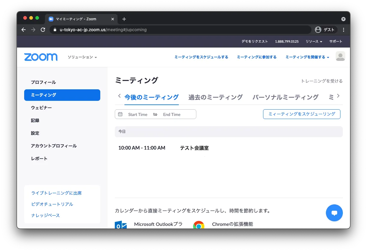 1. Web ブラウザでZoomの「ミーティング」のページへ移動します.