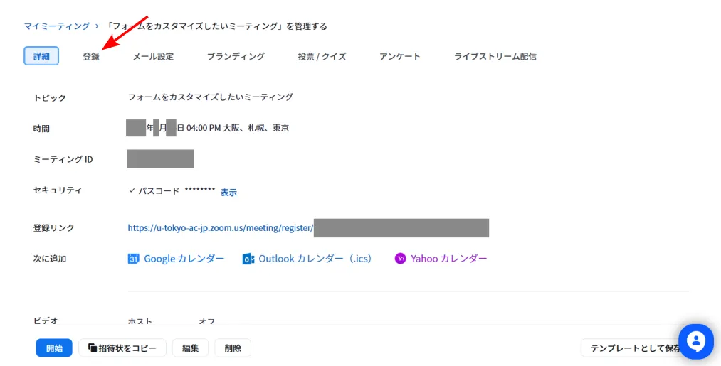 ミーティングの情報が表示されます.上の方に「登録」「メール設定」等のタブが並んでいます.「登録」タブを選択してください.