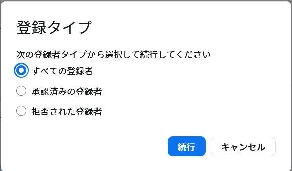 続けて表示される画面で,集計の対象となる参加希望者を選択してください.「すべての登録者」,「承認済みの登録者」,「拒否された登録者」から選択し,「続行」ボタンを押してください.