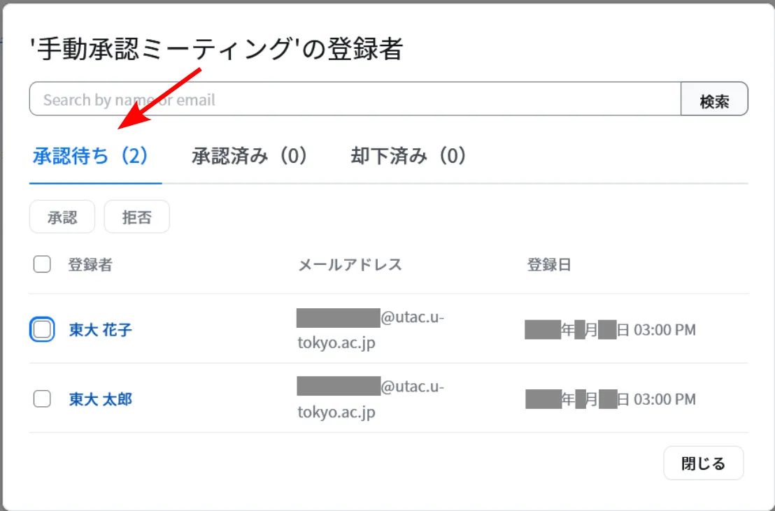 - 表示される画面の「承認待ち」リストに,登録手続きを済ませた参加希望者の一覧が表示されます.