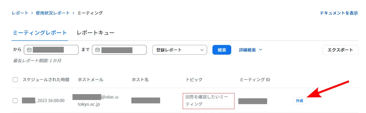 ミーティングの一覧が表示されます.集計結果を見たいミーティングを探し,右側にある「作成」ボタンを押してください.