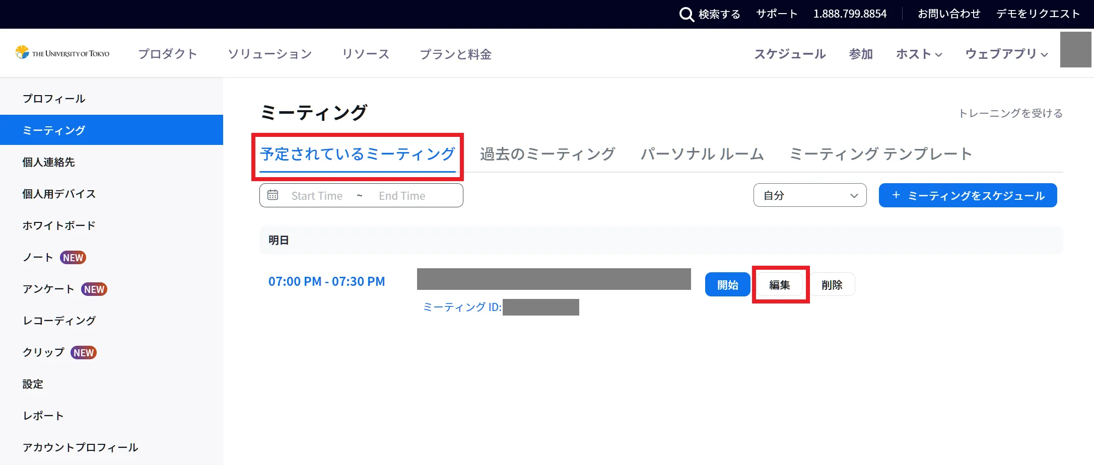 - 対象とするミーティングにカーソルを合わせると,新しく「編集」が表示されます.これを選択してください.