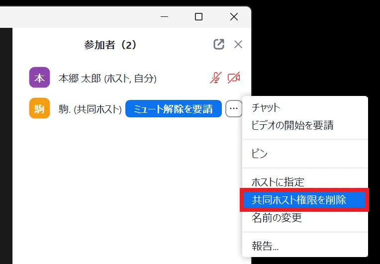 なお,必要が済んで共同ホストを解除する場合は,「共同ホスト権限を削除」を選択してください.