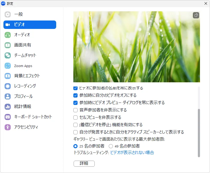 詳細タブの中の,「ミーティング」を押すと,ミーティング中のオーディオやビデオの設定を行うことができます.