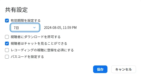 - 「有効期限を設定する」にチェックを入れて日数を選択することで,共有された相手がレコーディングを視聴できる期限を設定できます.