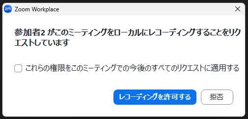 - 「このコンピュータでレコーディングする権限をリクエストする」を押してリクエストを送信すると,ホストの画面に下の画像のようなダイアログが表示されます.ホストが「レコーディングを許可する」を選択すると,リクエストを送信した参加者にローカルレコーディングの権限が付与されます.