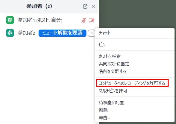 - レコーディングの権限を有さない参加者は,ホストや共同ホストにレコーディングをリクエストできます.