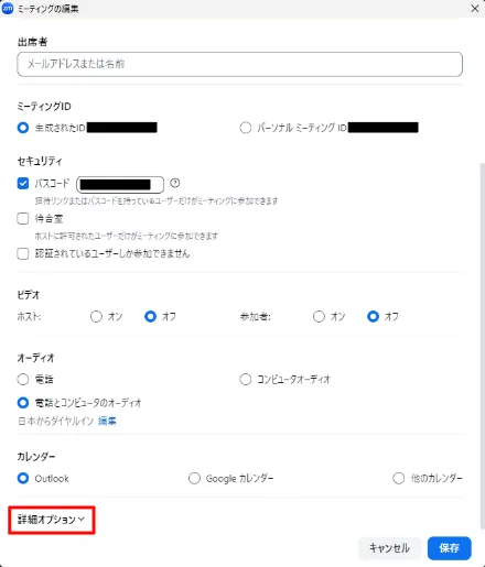 - ミーティングの作成または編集画面下部の,「オプション」または「詳細オプション」という項目を開き,「ミーティングを自動的にレコーディング」にチェックを入れてください.